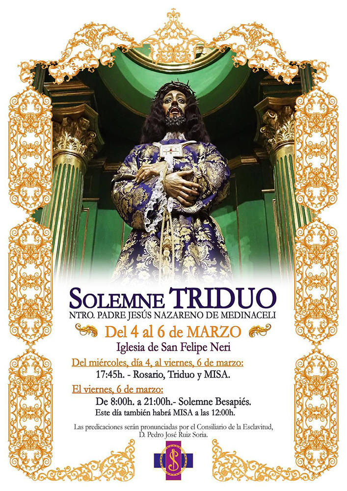 Los Cultos empiezan el 4 de marzo con el Solemne Triduo, que se desarrollará hasta el próximo viernes. A las 17:45 horas dará comienzo el rezo del Rosario al que seguirán las Preces del Triduo. Después se celebrará la Santa Misa. Pronunciará la homilía el consiliario de la Esclavitud, Pedro José Ruiz Soria.