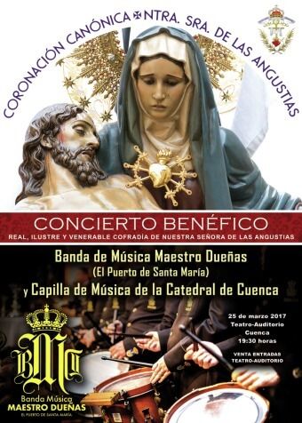 La cita será a partir de las 19:30 horas y, además de solidaria, supondrá una oportunidad para escuchar en Cuenca a una de las bandas más insignes de nuestro país: la Banda de Música “Maestro Dueñas” del Puerto de Santa María (Cádiz), acompañada además en el escenario por la Capilla de Música de la Catedral de Cuenca, que es Hermana Mayor Honoraria de la Cofradía de las Angustias. Las entradas están a la venta en la página web del Teatro Auditorio de la ciudad.