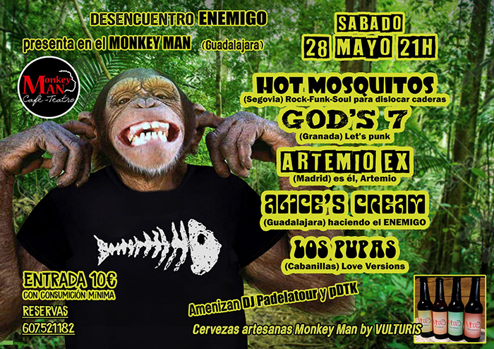 Con motivo de la actuación del grupo LOS ENEMIGOS, junto a ILEGALES y ALICE´S CREAM en la primera jornada del festival VIVE FEST a celebrar este viernes 27 de mayo en la plaza de toros de Guadalajara, los seguidores de la banda madrileña -con vinculación a Guadalajara, en concreto a Moratilla De Los Meleros, donde han pasado temporadas y han ensayado y preparado discos y giras-, han organizado lo que ellos denominan como ‘Desencuentro Enemigo’ a celebrar el próximo sábado 28 de mayo a partir de las 21 horas en la Sala Monkey Man Café Teatro de Guadalajara.