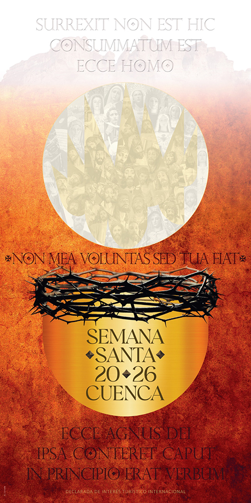 Cuando, pasadas las 20:30 horas, el Cartelista y, en esta ocasión y como licencia especial, el vicepresidente de la Junta de Cofradías, Antonio Abarca, levantaban el repostero de la institución para desvelar la imagen más esperada de la Pasión de este año, el Auditorio en pleno recibía con un largo aplauso a un Cartel concebido visualmente como un quiasmo perfecto a través de siete frases relevantes en el Evangelio, del rojo de la sangre, de la liturgia del Viernes Santo y hasta de la luz del atardecer nazareno de Cuenca, y a través, como no podía ser de otra manera, de la omnipresencia del Cuerpo de Cristo, con la propia ciudad simbolizada en el cáliz de la parte inferior y el sufrimiento en la corona de espinas del centro. No faltan en el Cartel las leyendas “Semana Santa 2026 Cuenca” y “Declarada de Interés Turístico Internacional”.