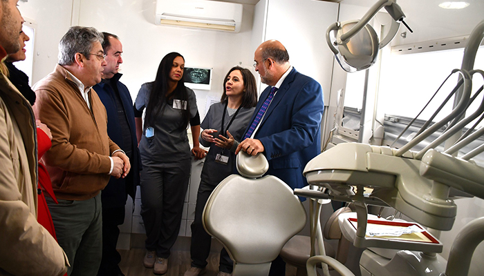 Junto a la delegada de la Junta en Cuenca, María Ángeles López; el delegado de Sanidad en la provincia, José María Pastor; el alcalde del municipio, Carlos Arteche; y el presidente de la Unión Democrática de Pensionistas, Justo Mora, el vicepresidente ha conocido esta clínica sobre ruedas cuya ideóloga es Raquel Pardo, que cuenta con 25 años de experiencia en el sector. Ahora, ha dado un paso más instalando este servicio de atención dental itinerante para llevarlo por los municipios donde no tienen este servicio.