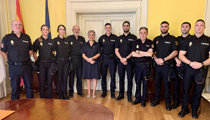 La subdelegada del Gobierno de España en Cuenca, Mª Luz Fernández, acompañada por el comisario jefe de la Comisaría Provincial de la Policía Nacional de Cuenca, Manuel Domínguez, ha recibido en las dependencias de la Subdelegación del Gobierno a los siete policías nacionales que harán las prácticas en la provincia de Cuenca.