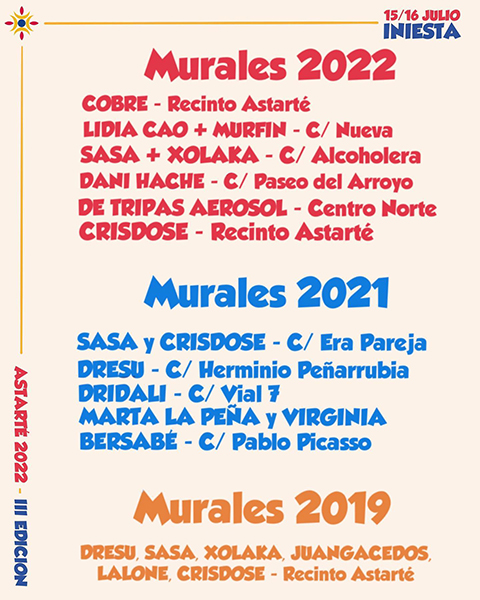 Esta tercera edición de Astarté contará también con viejos amigos que apenas necesitan presentación como Sasa, Christian Saldaña, que ha estado presente en cada edición y el pueblo de Iniesta ha podido disfrutar de su evolución como artista, y con Xolaka, Ángel Caballero, que estuvo presente en la primera edición del festival y que “abarca una gran variedad de artes creativas, que van desde el diseño multimedia, diseño web, pasando por artes plásticas y finalizando en artes visuales”.