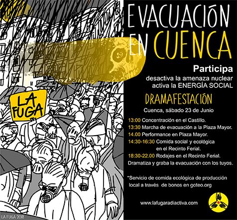 La capital conquense se prepara para su Evacuación el 23 de junio, una contestación teatralizada en contra de la instalación del cementerio nuclear (ATC) y a favor de un modelo energético más justo, renovable, limpio y económico. Tras la llegada del nuevo Gobierno las organizaciones ecologistas exigen un cambio de rumbo en las políticas sobre energía. Los convocantes esperan que La Evacuación en Cuenca “sirva para desequilibrar la balanza en favor del no al ATC”.