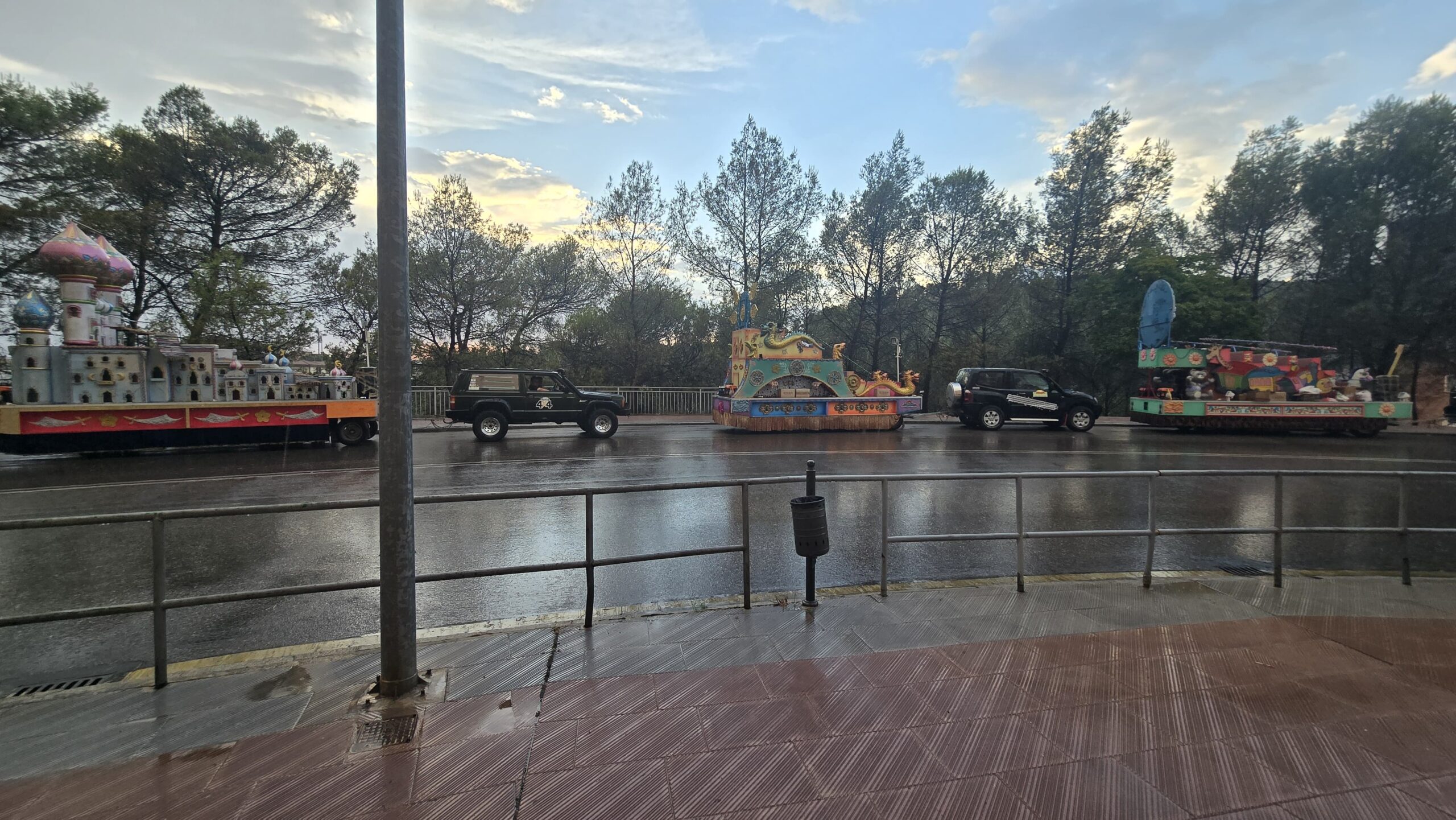 La tromba de agua y granizo caída sobre Cuenca afecta la salida de las Carrozas y los Gigantes se cobijan bajo los árboles.