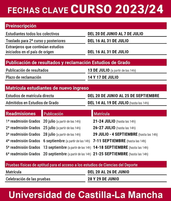 La Universidad de Castilla-La Mancha (UCLM) abre el 14 de julio el plazo de matrícula para estudiantes que vayan a comenzar primer curso de grado el próximo mes de septiembre y que hayan obtenido plaza en el proceso de preinscripción de la convocatoria única oficial, cuyos resultados se publicarán el 13 de julio. Junto a la resolución de su preinscripción -que indica en qué grado han sido admitidos/as-, los alumnos recibirán en su correo electrónico una cita previa a partir de la cual podrán formalizar su automatrícula, siempre antes de las 14:00 horas del 19 de julio. La cita previa también puede consultarse en la aplicación de cita previa.