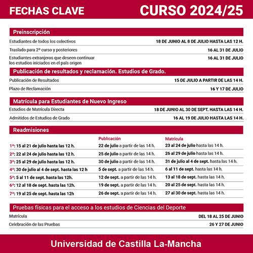 La Universidad de Castilla-La Mancha (UCLM) abre entre el 18 de junio y el 8 de julio (hasta las 12:00 del mediodía) el período de preinscripción en estudios de grado para el curso 2024-2025. Este trámite para solicitar una plaza es un requisito previo al de matrícula, que en la UCLM se extenderá entre el 16 y el 19 de julio (hasta las 14:00 horas) para el alumnado de nuevo ingreso admitido en las primeras listas en estudios de grado, y entre el 18 de junio y el 30 de septiembre para quienes opten por estudios de matrícula directa. Además, se abrirán periodos específicos de matrícula para quienes logren la admisión en alguna de las siete readmisiones establecidas.