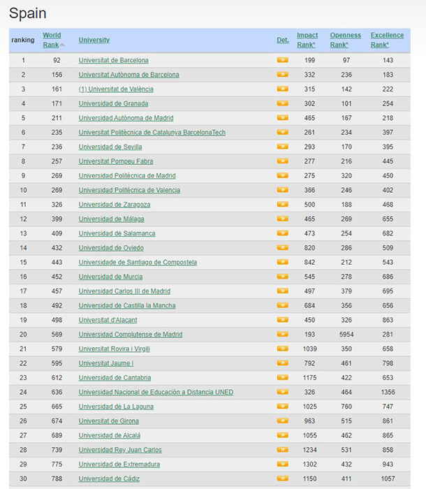 El Ranking Web of Universities se elabora con indicadores relacionados con la presencia y la visibilidad en la red de treinta y un mil universidades y centros de investigación, el impacto de los contenidos de sus webs, el número de artículos entre el diez por ciento más citado en cada una de las 27 disciplinas del Scimago Journal Rank (que mide la influencia científica de las revistas académicas) y los investigadores más citados (según los perfiles académicos de Google).