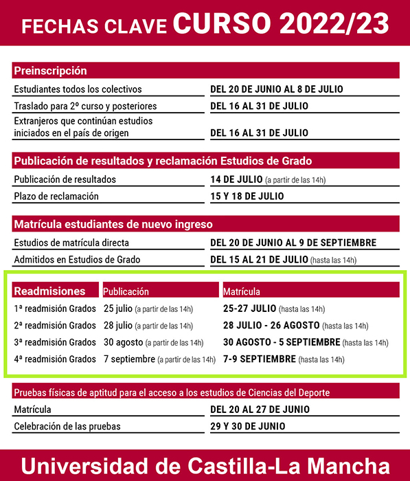 La Universidad de Castilla-La Mancha (UCLM) publicará el 25 julio (a partir de las 14:00 horas) la relación de estudiantes admitidos/as en la primera readmisión de las cuatro arbitradas por la institución académica para el acceso a grado en el curso 2022/23. En este proceso pueden participar todas las personas que realizaron la preinscripción que se resolvió el 14 de julio y no obtuvieron plaza en los estudios solicitados en primera opción o en ningún otro y, para ello, tuvieron que solicitar expresamente ser readmitidos para la lista del 25 de julio. Si tampoco obtienen plaza en esta primera readmisión, o no consiguen acceder a los estudios de mayor preferencia, tendrán otras tres oportunidades en las readmisiones que se resuelven los días 28 de julio, 30 de agosto y 7 de septiembre.
