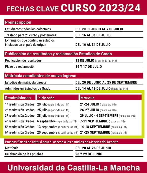 El estudiantado que desee acceder a estudios de grado en la Universidad de Castilla-La Mancha (UCLM) para el próximo curso 2023/24 dispone de seis posibilidades de readmisión adicionales que se publicarán y comunicarán los días 20, 25 y 28 de julio, y 6, 13 y 20 de septiembre. Para participar en este proceso es imprescindible que la persona interesada marque la opción en la aplicación de preinscripción. Paralelamente, continúa abierto el período de preinscripción/matrícula en estudios de matrícula directa.