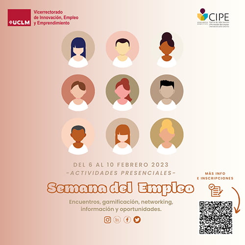 La Semana del Empleo del CIPE es un programa de desarrollo profesional que pretende facilitar a los estudiantes el tránsito al mercado laboral. Dirigido a estudiantes de los últimos cursos de todas las titulaciones que oferta la UCLM, en esta edición se llevarán a cabo diferentes actividades como charlas, escape room o desayunos de trabajo, que acercarán al estudiantado universitario y a egresados a un entorno laboral cada vez más dinámico.
