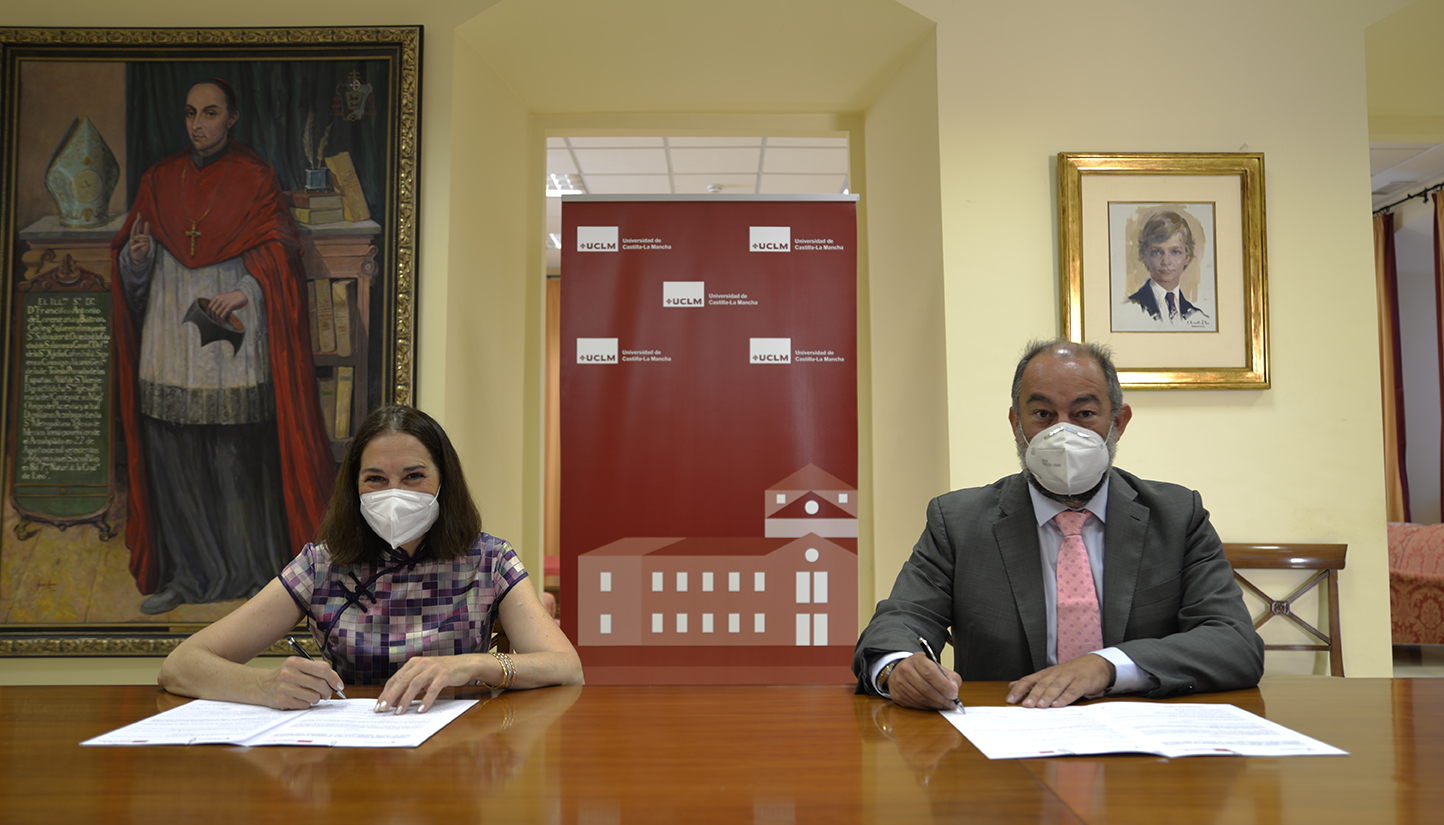 El rector de la Universidad de Castilla-La Mancha (UCLM), Julián Garde López-Brea; y la directora general del Territorio Centro de Telefónica, Beatriz Herranz, han firmado hoy el convenio para la renovación de la Cátedra Telefónica – Universidad de Castilla-La Mancha sobre Sistemas Avanzados de Interacción para la Educación Digital.