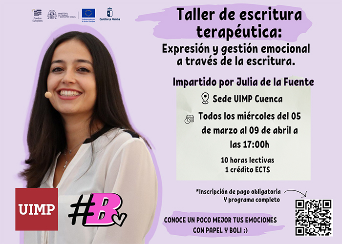 Desde el miércoles 05 de marzo al miércoles 09 de abril se impartirá en la sede de la UIMP en Cuenca un Taller de escritura terapéutica en el que se usará la escritura como herramienta de compresión, regulación y gestión emocional, buscando dotar a los participantes de un mayor conocimiento de sus emociones y el porqué de estas al mismo tiempo que se les proporcionan herramientas prácticas para gestionarlas, entenderlas y expresarlas.