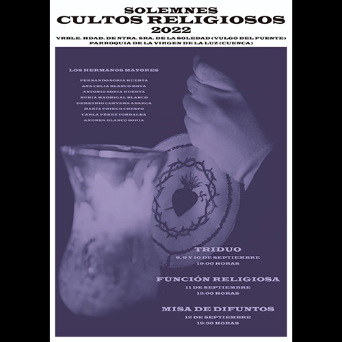 La Función religiosa está prevista para las 12 horas del domingo 11 de septiembre y será oficiada por el consiliario de la Hermandad, Ángel García Benedicto. Acompañará musicalmente el Coro del Conservatorio de Cuenca.