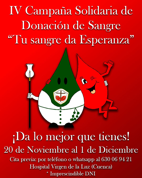 La Venerable Hermandad de María Santísima de la Esperanza lanza su IV Campaña Solidaria de Donación de Sangre ‘Tu sangre da Esperanza’, con la que pretenden ayudar a nutrir las reservas de sangre del Hospital Virgen de la Luz de la capital conquense y continuar desarrollando el programa de acciones solidarias que la Hermandad pone en marcha a lo largo de todo el año.