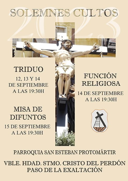 Así, los días 12, 13 y 14 de septiembre se celebrará el Triduo en honor a su Titular; será a partir de las 19:30 horas. El jueves 14 de septiembre y también a las 19:30 horas será la solemne Función religiosa. Los Cultos finalizan el viernes 15 de septiembre con la misa por los hermanos difuntos, prevista para las 19:30 horas.