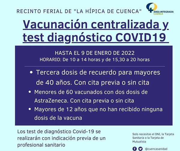 La vacunación centralizada que se está llevando a cabo esta semana en el Recinto Ferial de “La Hípica” de Cuenca se abre a los mayores de 40 años que deseen recibir la tercera dosis de recuerdo frente a la Covid-19.