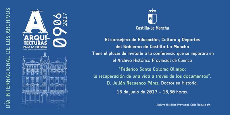 El próximo 13 de junio, a las 18’30 horas, tendrá lugar en el Salón de Actos del Archivo Histórico de Cuenca la conferencia titulada ‘Federico Santa Coloma. La recuperación de una vida a través de los documentos’, a cargo de D. Julián Recuenco Pérez, Doctor en Historia.