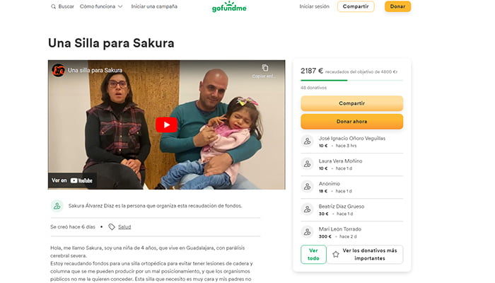 “Estoy recaudando fondos para una silla ortopédica para evitar tener lesiones de cadera y columna que se me pueden producir por un mal posicionamiento, y que los organismos públicos no me la quieren conceder”, cuentan los padres de la menor, en voz de Sakura.