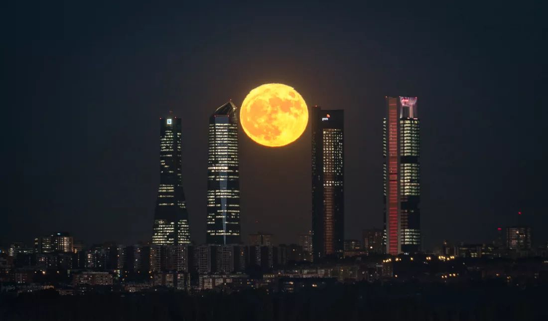 En la foto que el fotógrafo astronómico Javier Martínez Morán capturó, llama la atención el tamaño de la luna durante este fenómeno natural durante una noche/mañana fresca de otoño, brillando con intensidad tras las imponentes Cuatro Torres de Madrid.