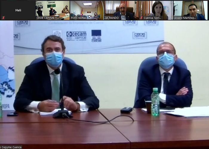 En una primera reunión telemática celebrada entre las Confederaciones de Cuenca, Soria y Teruel y sus Diputaciones Provinciales han participado el presidente de FOES, Santiago Aparicio, el de CEOE CEPYME Cuenca, David Peña y el de CEOE Teruel, Juan Ciércoles, así como el presidente de la Diputación de Soria, Benito Serrano, el de la institución provincial de Cuenca, Álvaro Martínez Chana y el de la Diputación de Teruel, Manuel Rando.