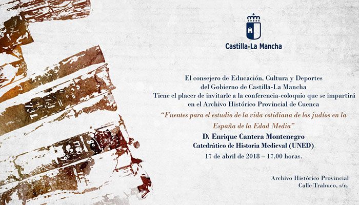El próximo martes, 17 de abril, tendrá lugar en el Archivo Histórico de Cuenca la conferencia titulada Fuentes para el estudio de la vida cotidiana de los judíos en la España de la Edad Media, a cargo del Prof. Dr. D. Enrique Cantera Montenegro, Catedrático de Historia Medieval (UNED).