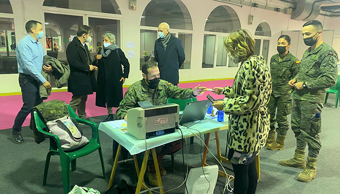La delegada provincial de Sanidad, Mari Luz Fernández junto al subdelegado del Gobierno de España en la provincia, Juan Rodríguez; el concejal de Cuenca y diputado provincial, Miguel Ángel Valero; el subdelegado de Defensa en la provincia, Fernando Antón y el director médico de Atención Primaria de la GAI de Cuenca, Jesús Buendía han visitado este punto de vacunación que ha incorporado a un equipo de sanitarios militares del Ministerio de Defensa.
