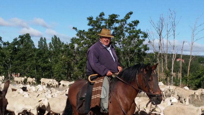 Manuel Villar Muñoz es un trashumante de Valdemeca (Cuenca) que lleva haciendo la vereda cuarenta y tantos años. Es inconfundible porque, además de ir siempre a caballo, es su figura la que destaca: bueno, he hecho la vereda y la sigo haciendo. Lo hice con el ferrocarril, en la época de bonanza -en la que se ganaba dinero con las ovejas- trasladaba a mis animales en camiones y ahora ya, con la crisis, hemos vuelto otra vez a la vereda que este año, le digo, está complicada por la falta de agua en algunos tramos: este año lo estamos pasando muy mal porque no hay agua. Ha habido días –dos en concreto- en los que los animales no han podido beber ni gota, me cuenta en un paraje bien conocido por los conquenses: el Chantre por el que discurre la Cañada Real de Rodrigo Ardaz junto al río Júcar.