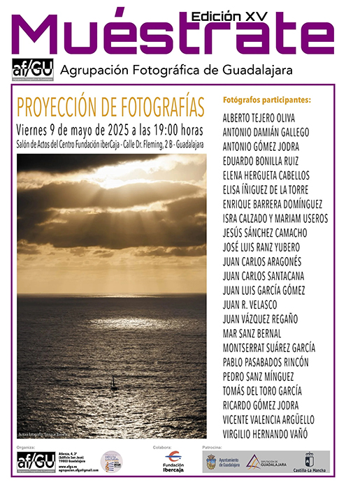 Entrada gratuita con inscripción en https://www.fundacionibercaja.es/actividades/proyecciones/xvedicion-muestrate-agrupacion-fotografica-guadalajara/