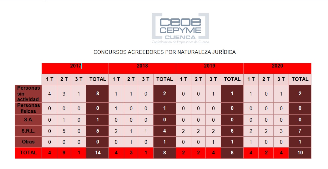 CEOE CEPYME Cuenca apunta que se mantiene un ligero aumento de los concursos de acreedores en la provincia de Cuenca tras analizar los datos publicados sobre el INE correspondientes a los primeros tres trimestres del año y comparados con este mismo período de 2019.