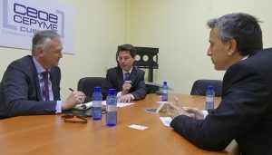 Así, Didier Denayer ha mantenido un encuentro en las oficinas de CEOE CEPYME Cuenca con el vicepresidente de la organización empresarial, Ignacio Villar, y el director del Departamento Económico, Miguel Ángel Santos, que le han trasladado detalles sobre el tejido productivo de la provincia y las distintas actuaciones de la organización.