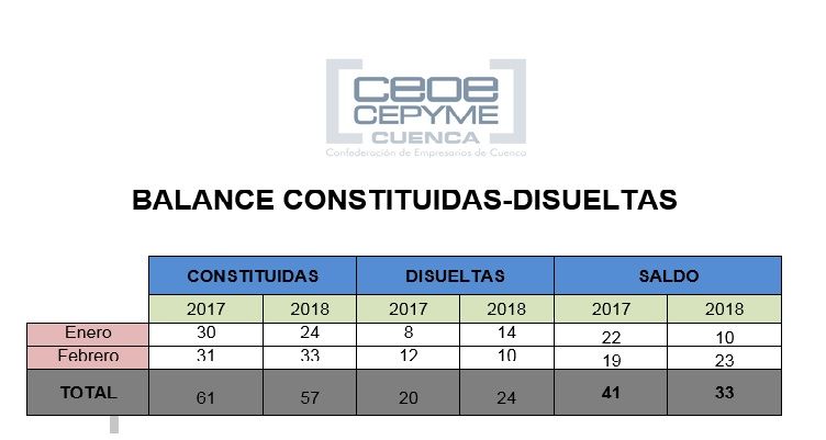 La Confederación de Empresarios de Cuenca, señala que el saldo sí es mejor en estos dos meses del año 2018 con respecto al 2016, con 11 sociedades más constituidas (+23,91%) y también con respecto a 2015 con 8 constituciones más (+16,32%).
