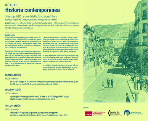Los ponentes, investigadores en activo, tratarán una amplia variedad de temas. David Benayas (UCM) comenzará la sesión con una ponencia sobre el uso del tiempo en el calendario franquista y su imbricación con el tiempo actual. Lo seguirá Juliá Martínez Cano (UCLM), quien abordará la imagen del marroquí en las revistas ilustradas de Falange durante la Guerra Civil. Finalmente, Víctor Sepúlveda (UCLM) cerrará con una intervención acerca de los museos de fotografías y la experiencia precursora que supusieron en España. El taller contará, además, con la participación de tres doctores especialistas en las materias tratadas: Ángel Luis López Villaverde, Irene González González y Beatriz Sánchez Torija.