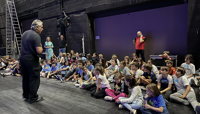 Uno de los momentos más enriquecedores fue la visita guiada por el teatro, en la que los técnicos del Buero Vallejo explicaron con detalle cada una de las estancias y su utilidad: desde el patio de butacas hasta el escenario, pasando por la cabina de luces y sonido, el foso de orquesta, la cámara negra, la tramoya, los camerinos y los vestuarios. Los participantes aprendieron curiosidades como que el bambalinón es el telón que cuelga horizontalmente desde el techo para reducir la altura de la escena, o que el peine es la estructura superior sobre el escenario que contiene las poleas y varas donde se cuelgan telones, focos y escenografías. En el caso del Buero Vallejo, esta estructura cuenta con 32 varas contrapesadas y 5 motorizadas, capaces de soportar hasta 17.000 kilos.