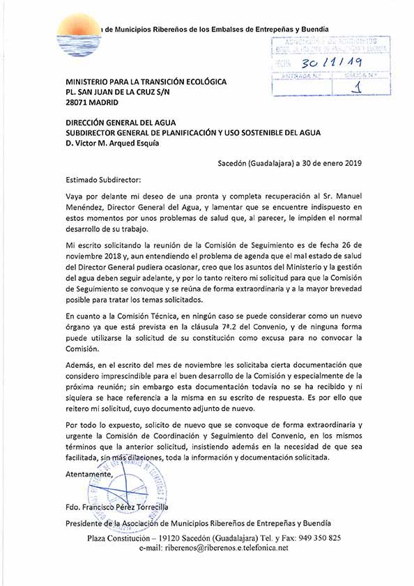 “Vaya por delante mi deseo de una pronta y completa recuperación al Sr. Manuel Menéndez, Director General del Agua, y lamentar que se encuentre indispuesto en estos momentos por unos problemas de salud que, al parecer, le impiden el normal desarrollo de su trabajo”, comienza la carta con la que el presidente de los ribereños da respuesta oficial al ministerio de Transición Ecológica, tras su escueta contestación, dos meses después, a la propuesta ribereña que por aquel entonces fue reflejada por los medios de comunicación mediante la correspondiente nota de prensa.