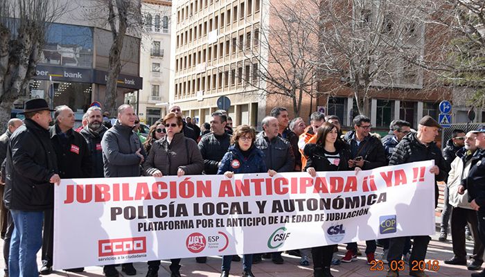 Una concentración convocada desde la Plataforma Estatal por el Adelanto de la edad de Jubilación de las Policias Locales y Autonómicas, de la que en Cuenca forman parte CCOO, UGT, CSIF y CSL, y cuyos responsables sindicales han estado al frente de la pancarta donde se podía leer: “Jubilación anticipada, YA”.