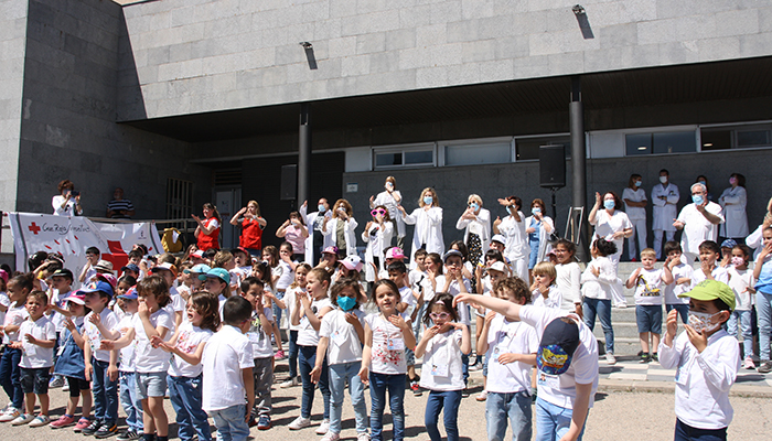 Bailes, canciones, coreografías, dibujos y “reparto de besos” para los niños convalecientes han conformado esta celebración a las puertas del “Virgen de la Luz”, a la que han asistido un grupo de unos 90 niños y niñas de Educación Infantil y Educación Primaria del centro educativo, cuyos profesores habían preparado previamente con ellos la celebración, ensayando la coreografía con las canciones “Un beso redondo” de Conchita y “Un mar de besos” del grupo Bombai y preparando dibujos, una pancarta y la lectura de los derechos de los niños hospitalizados establecidos en la Carta Europea del 13 de mayo de 1986 del Parlamento Europeo.