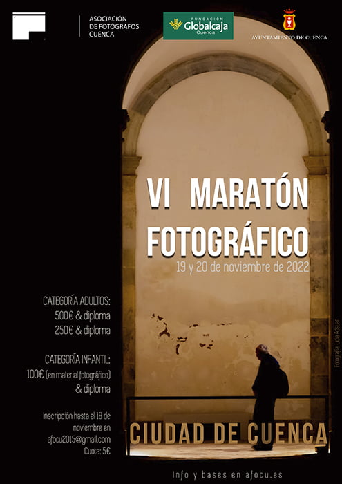 Los próximos 19 y 20 de noviembre se celebra el VI Maratón Fotográfico “Ciudad de Cuenca”Durante el sábado 19 y el domingo 20 de noviembre los fotógrafos conquenses y visitantes podrán participar en la que ya es la sexta edición del Maratón Fotográfico “Ciudad de Cuenca”. A parte de la duración, también habrá novedad en lo que se refiere a la temática del evento, que no se dará a conocer hasta el mismo día de la prueba. El punto de inicio de la misma será el Museo Paleontológico de Castilla- La Mancha (MUPA) el sábado 19 a las 12 de la mañana.