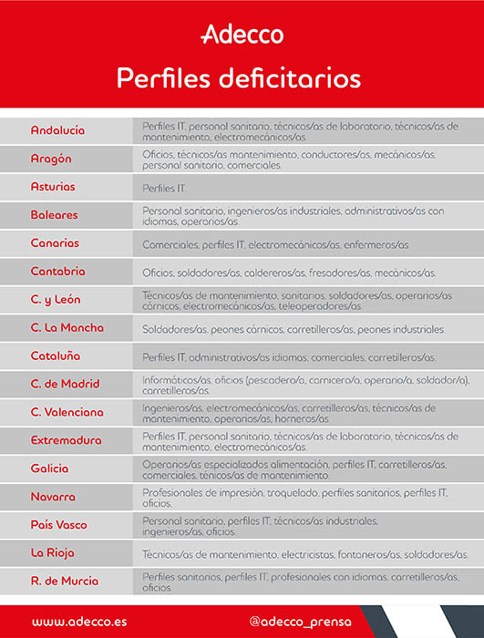 En este contexto, Adecco, líder mundial en gestión de recursos humanos, quiere conocer de primera mano cuáles son esos perfiles que son deficitarios en nuestro mercado de trabajo y cuáles son las razones que están llevando a esta situación y lo presenta en su Informe Adecco sobre perfiles deficitarios y escasez de talento en España.