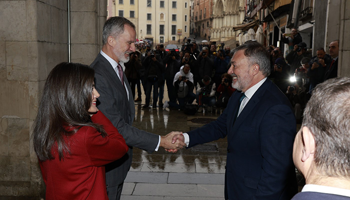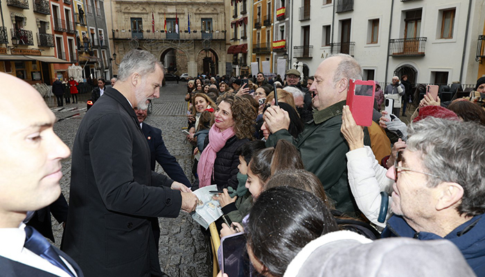 Seguidamente, Don Felipe y Doña Letizia accedieron al interior del edificio donde recibieron el saludo de los miembros de la Corporación Municipal en el Salón de Plenos y, tras firmar en el libro de honor en el despacho del alcalde, recibieron como obsequio el libro y facsímil de planos «Vistas de Cuenca de Juan Llanes y Massa 1773».