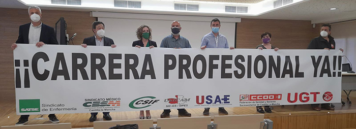 Los sindicatos con representación en la Mesa Sectorial (SATSE, CESM, CSIF, USICAM, USAE, CCOO y UGT) han presentado hoy en rueda de prensa en Toledo el inicio de las Movilizaciones para conseguir la reanudación del sistema de Carrera Profesional en el SESCAM.