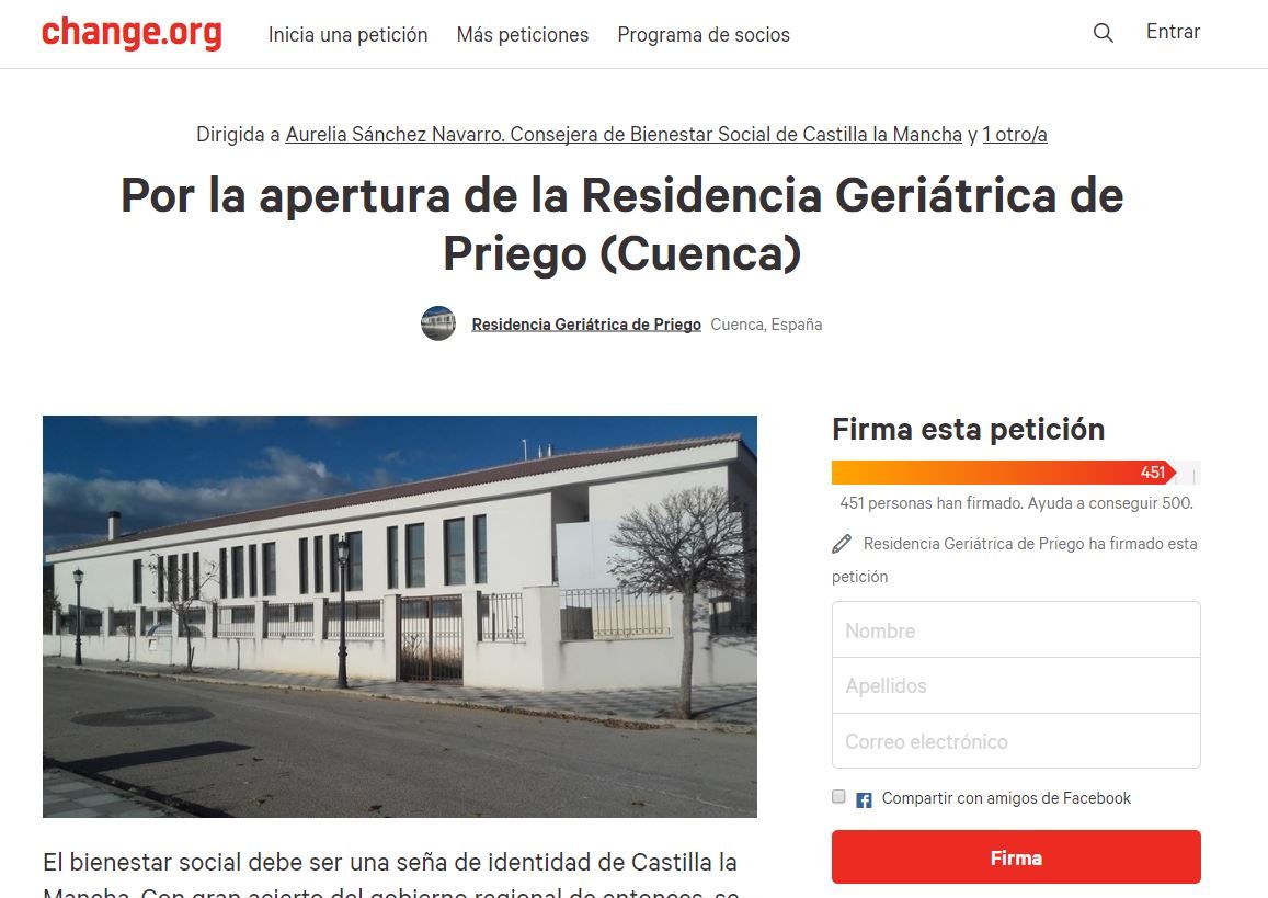 Así comienza el escrito de los vecinos de Priego, los cuales se han unido a la plataforma Change.org para recogen firmas y exigir a la JCCM la apertura de la residencia geriátrica. En menos de 24 horas 450 las personas ya han firmado el manifiesto dirigido a la señora, Aurelia Sánchez, consejera de bienestar social.