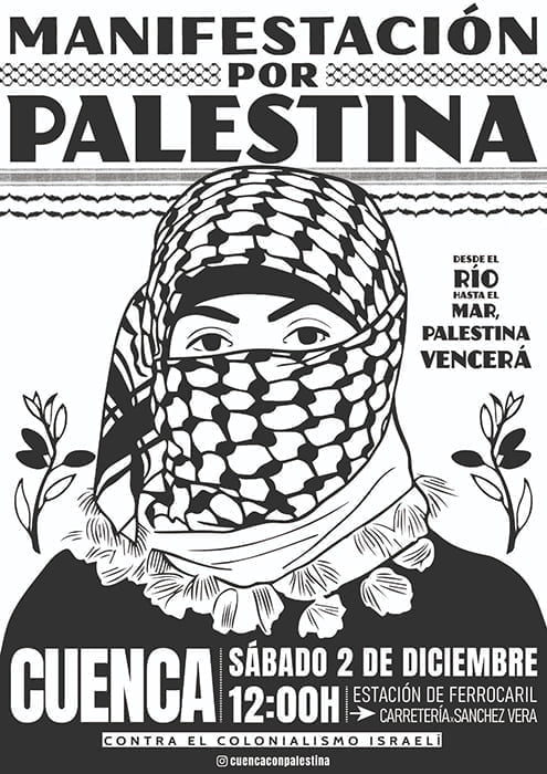 La ciudadanía de todo el mundo se está movilizando para pedir que pare el genocidio del estado de Israel a la población palestina. En Cuenca, como no podía ser menos, se ha organizado un grupo de solidaridad par a llamar a la solidaridad con el pueblo palestino y condenar la masacre de todo un pueblo a manos del estado de Israel. Semanalmente, se vienen convocando concen traciones todos los viernes a las 19:30 horas en el cruce de la calle Carretería con Sánchez Vera. Viendo que el genocidio cometido por Israel no cesa, y sólo se prevé un alto el fuego temporal, convocamos una manifestación el próximo sábado 2 de diciembre que saldrá a las 12.00 de la antigua estación de trenes, finalizando en la calle Carretería, cruce con Sánchez Vera.
