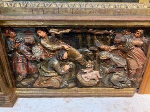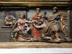 En la parte inferior del retablo encontramos sendos relieves, en madera, “que son anteriores a la guerra civil. Representan a la Adoración de los Pastores y a la de los Reyes Magos y, por lo que se lee en una de las tablas, datan del año 1618. Son de un renacimiento tardío porque, por otras partes de esa España, sobre todo por el sur, asomaba ya un barroco que llegaría a nuestros pueblos de esta zona años después. Son altorrelieves con mucho volumen pero que, en la guerra, sufrieron serias mutilaciones en cabezas, caras, brazos… Son de gran calidad y, el maestro que los esculpió era un buen escultor. Se trata de relieves en madera que han sido muy agradecidos porque no han tenido intervenciones aparentes. Se les dio una especie de betún marrón, que camufló el color de origen, con lo que les ayudó a conservarse” nos explica Rosario añadiendo que, en los años 30, o anteriores, no se entendía la restauración como ahora por respeto a la obra. Se limpiaban con agua y jabón o con lo que tenían a mano. “La limpieza ha sido costosa pero gratificante porque salía debajo una pintura de calidad”.