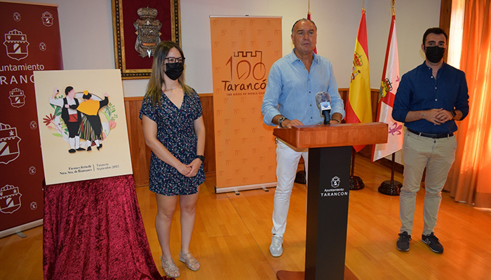 El alcalde de Tarancón, José Manuel López Carrizo, ha presentado el cartel acompañado de la artista y del concejal de Cultura, Raúl Añover.
