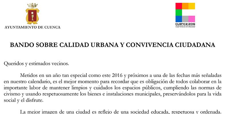 El alcalde de Cuenca, Ángel Mariscal, ha dictado un Bando Municipal por el que hace un llamamiento a la colaboración ciudadana para mantener limpios y cuidados los espacios públicos en la que es una responsabilidad compartida y especialmente de cara a este año 2016 en que Cuenca conmemora sus veinte años como Ciudad Patrimonio de la Humanidad.