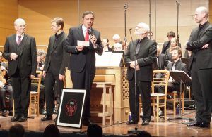 El alcalde de Cuenca y presidente del Patronato de la Semana de Música Religiosa (SMR), Ángel Mariscal, y el director artístico, Cristóbal Soler han entregado los dos premios honoríficos de la 57 edición de la SMR al director de orquesta Ton Koopman, por su dilatada carrera artística musical fundamentalmente dedicada a la interpretación del repertorio barroco; y en la Modalidad Agrupación, a la Orquesta y Coro Barroco de Amsterdam. Ambos han interpretado la ‘Pasión según San Juan’ de Bach en el Auditorio.