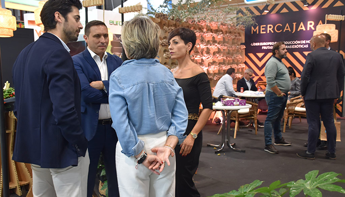 El presidente ha hablado con los representantes de las empresas conquenses para conocer de primera mano el balance que hacen de su paso por la feria. El stand de Mercajara ha sido seleccionado por la organización de la Fruit Attraction como uno de los mejores. Esta empresa conquense ha apostado por una celosía de cartón con hongos frescos. Un diseño disruptivo obra de María Luisa Aroca que ha llamado la atención del jurado.