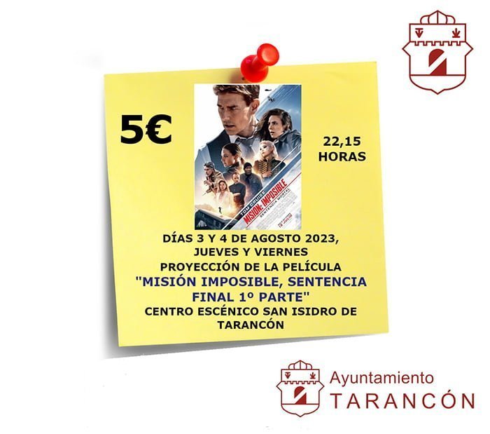 La programación continúa este mes de agosto con ‘Misión Imposible, sentencia final 1ª parte’, que se proyecta los días 3 y 4 de agosto; y con ‘Barbie’, que se podrá ver en Tarancón los días 5, 6 y 7 de agosto. La cartelera también incluye ‘Insidious, la puerta roja’ (los días 10 y 11), ‘De perdidos al río’ (los días 13 y 14) y ‘Megalodón 2, la fosa’ (los días 17 y 18). El resto de películas de agosto se irán anunciando en próximas fechas.