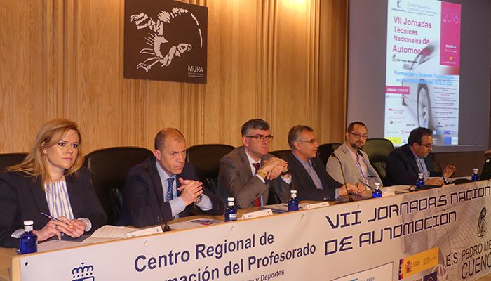 En la inauguración de las jornadas estuvieron presentes el presidente de TRACC, Miguel Garrote, el secretario general de CEOE CEPYME cuenca, Ángel Mayordomo, el delegado provincial del Gobierno Regional en Cuenca, Ángel Tomás Godoy, la directora provincial de Educación, Cultura y Deportes, Mª Ángeles Martínez, el director del IES Pedro Mercedes, Mariano Moya, y los coordinadores de las jornadas Esteban J. Domínguez y Juan Marín.